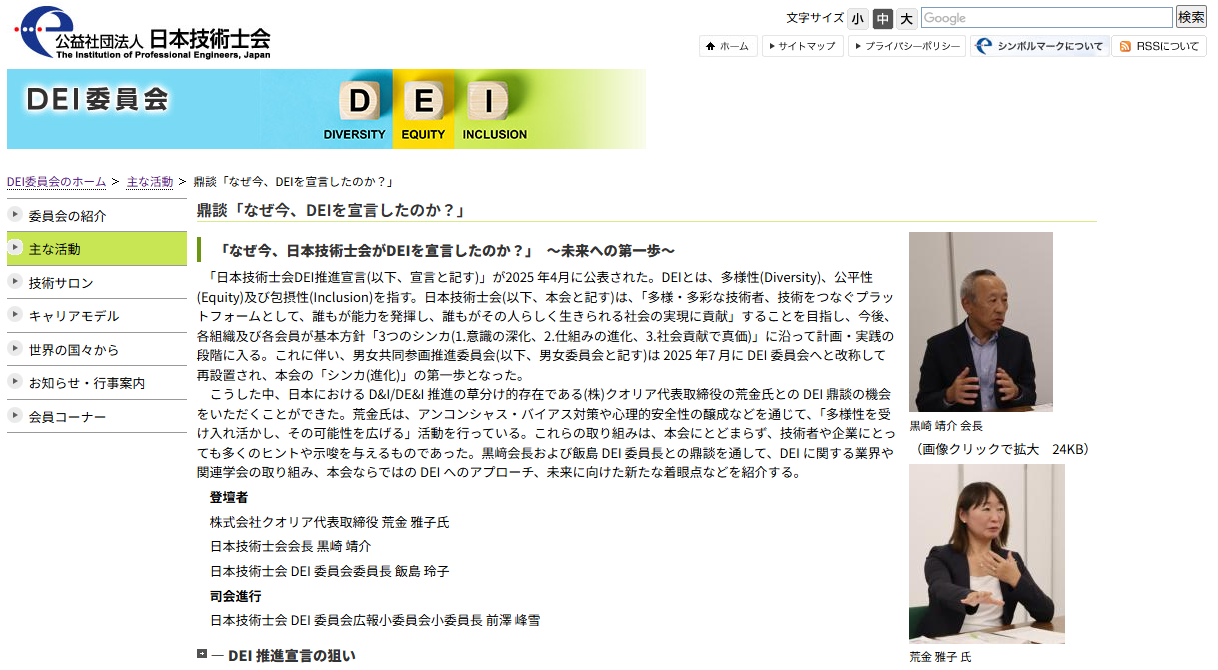 公益社団法人 日本技術士会様は、2025 年4月には、「多様・多彩な技術者、技術をつなぐプラットフォームとして、誰もが能力を発揮し、誰もがその人らしく生きられる社会の実現に貢献」を目指し、『日本技術士会DEI推進宣言』を公表されました。それに合わせて、 男女共同参画推進委員会を、DEI委員会に改称されました。それを記念し、2025年8月25日に同会会長 黒崎様と同会 DEI 委員会委員長 飯島 玲子様、株式会社クオリア 代表取締役の荒金雅子による鼎談が開催されました。